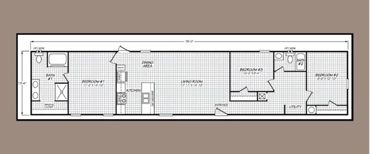 Floor plan of a singlewide modular house with three bedrooms, two bathrooms, a kitchen, a dining area, a living room, and a utility room.